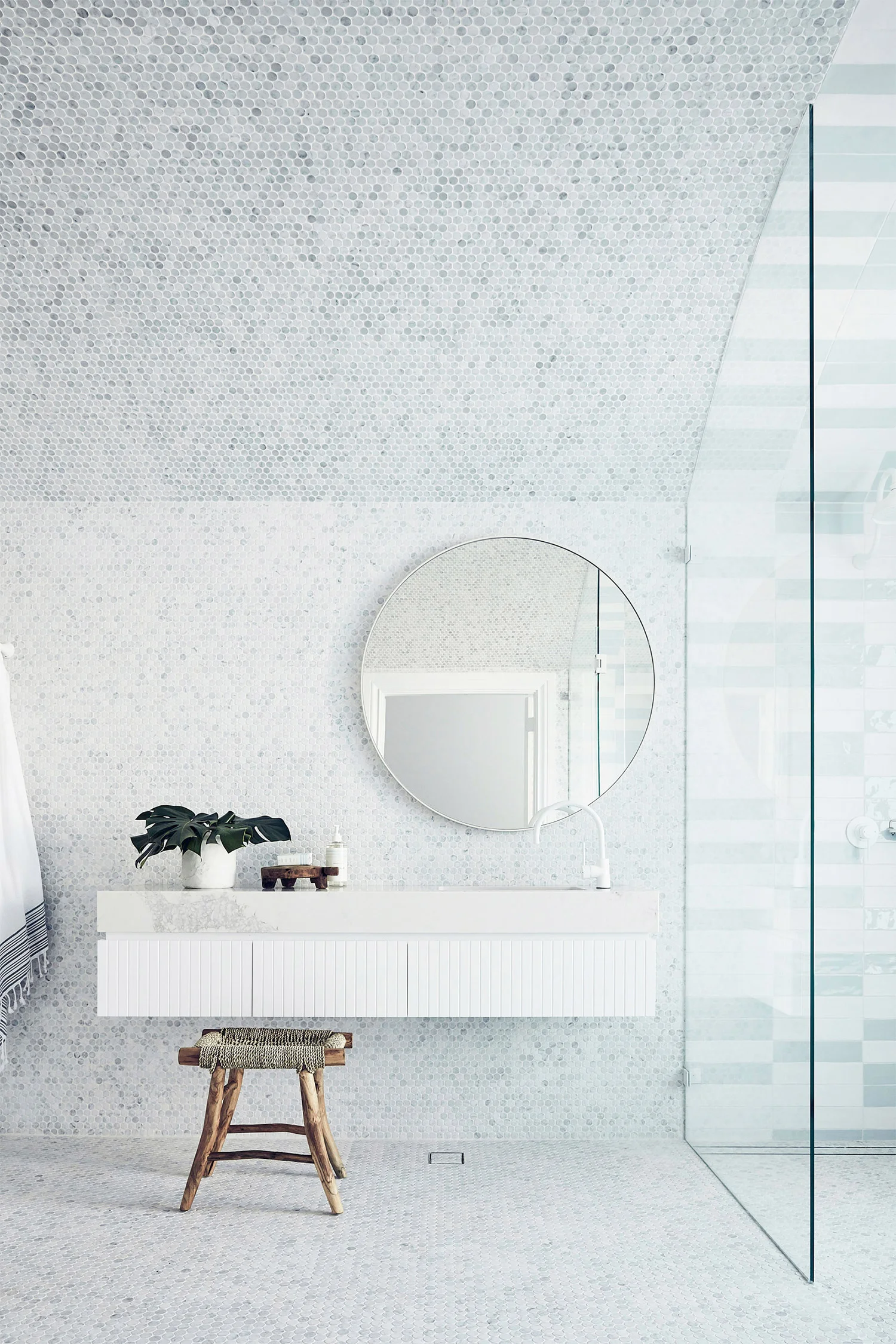 I also think if you use 2 different tiles on walls and floors, using the same grout color on both is a good way to tie the 2 tiles together for a more harmonious room.